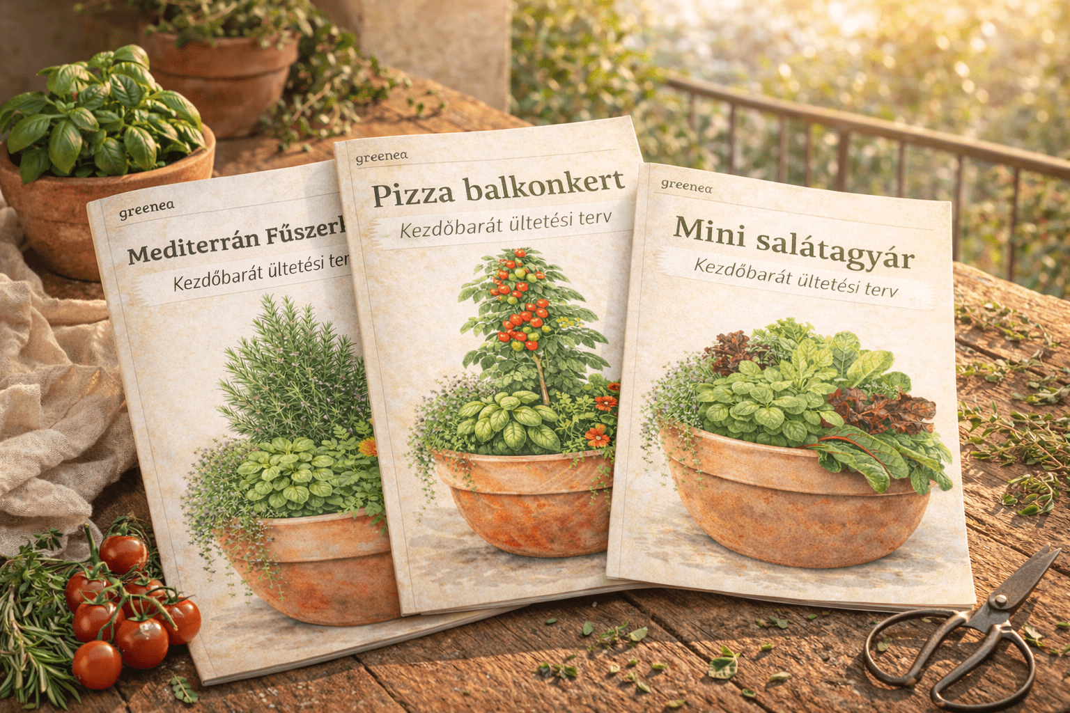 Ebben a csomagban három kész balkonláda-tervet kapsz: egy pizza feltéteket termelő ládát, egy mediterrán fűszerkertet és egy folyamatos salátatermést adó összeültetést. Mindegyik terv felülnézeti elrendezéssel, ültetési sorrenddel és bevásárlólistával készült, így egyszerűen követhető.